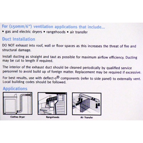 The Deflect-o Supurr-Flex Duct comes in a flexible 150mm (6′) diameter, 3.6m (12ft) length, easy to install & is fire resistant, temp range -18°C to +130°C. Suitable for use on gas & electric clothes dryers, rangehoods & general ventilation. Multi-layered with pure aluminium. Install as straight & taut as possible for maximum efficiency, may be cut to length if required.
